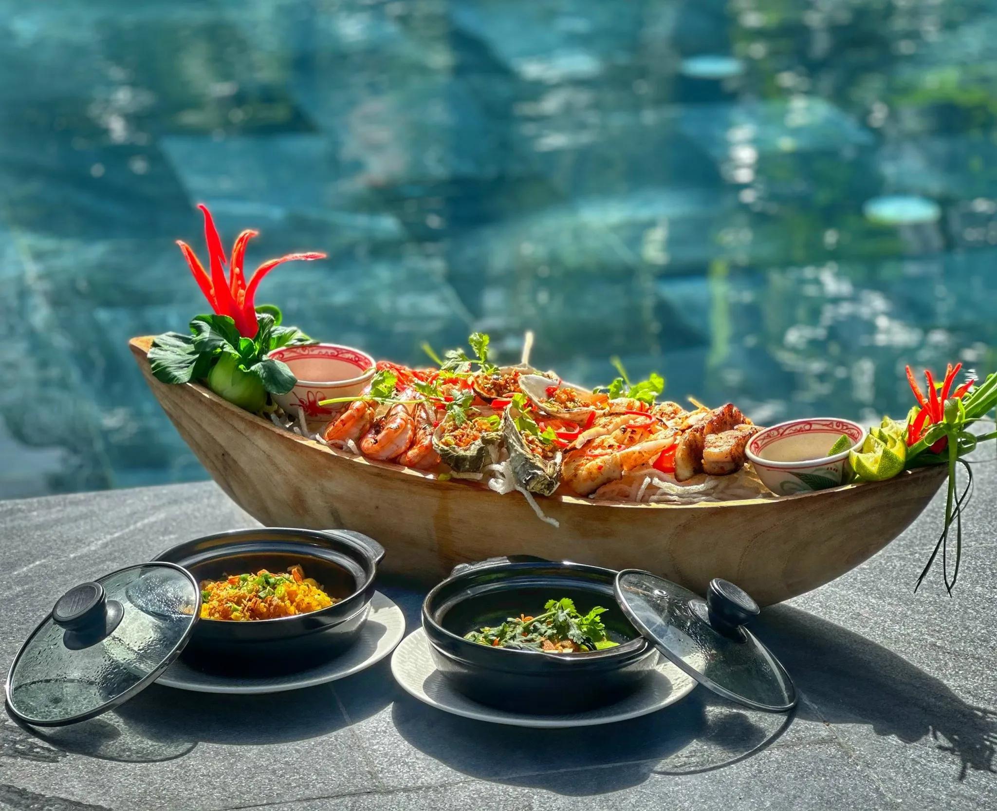 Thưởng thức những món hải sản tươi sống được chế biến tinh tế và trình bày độc đáo trên chiếc “thuyền gỗ” biểu tượng cho văn hóa miền duyên hải. Tôm, cua, mực, sò… kết hợp cùng gia vị bản địa tạo nên trải nghiệm ẩm thực vừa sang trọng, vừa gần gũi thiên nhiên. Được đánh bắt từ vùng biển miền Trung, mỗi nguyên liệu đều giữ được độ tươi ngọt tự nhiên, là nền tảng cho chất lượng món ăn đỉnh cao.